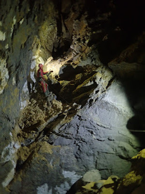 Zape equipa el pozo y le sigo con la topo, en el fondo buscamos puntos de topo que nos confirmen donde hemos llegado, que parece un amplio meandro descendente con resaltes y bucles, que como marcaba la topo, se trata de una de las vías que descienden desde el primer vivac y que parte del río del Kalasnikof.